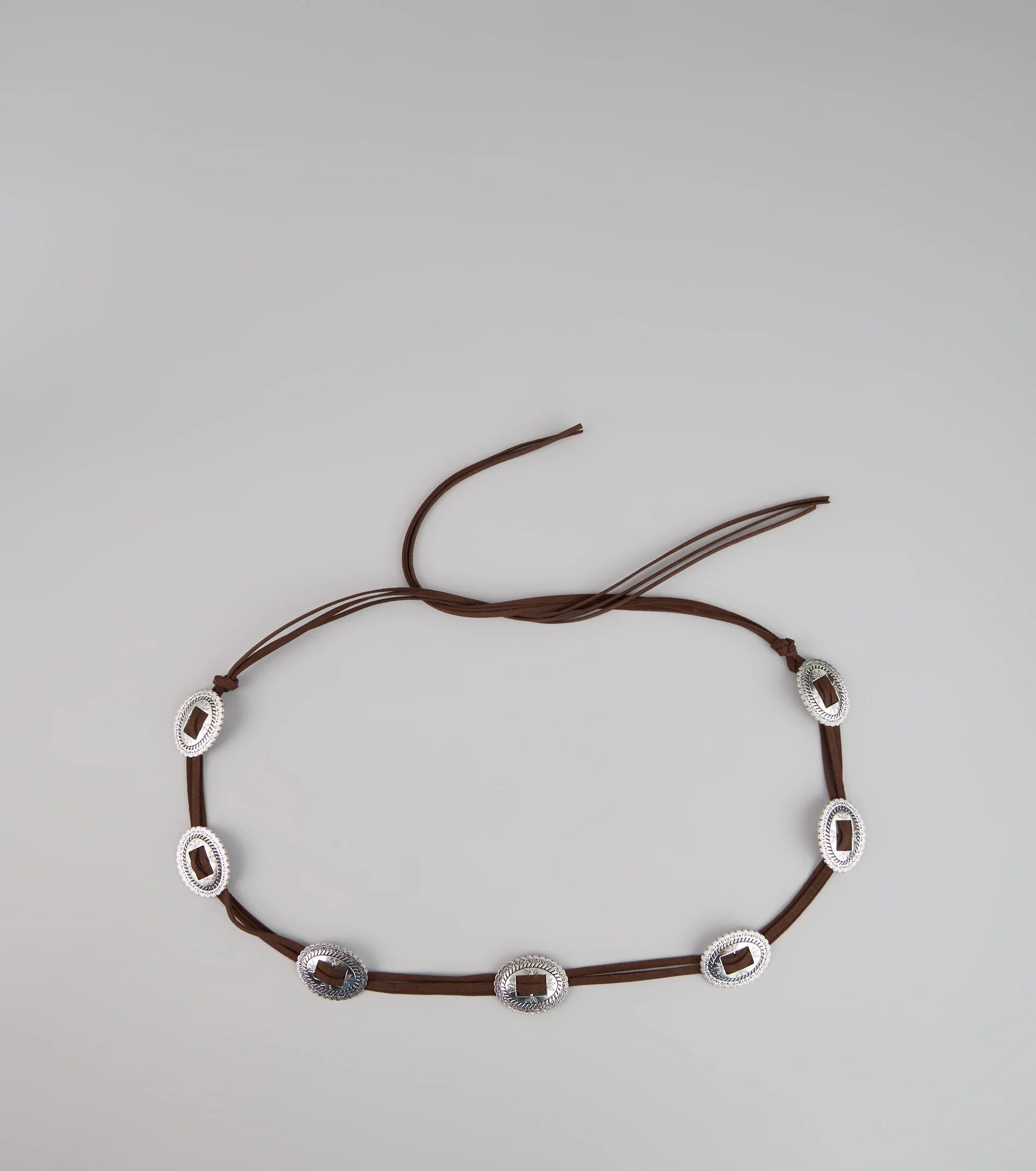Cowgirl vibes, polished finish. This faux suede string belt with concho accents is the perfect waist-cinching piece to add a little western charm to dresses, skirts, or denim.