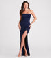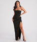 Captivating yet subtle details create the eye-catching Whittney formal crepe dress perfect for fancy parties, cocktail events, and galas! She stuns in a classic strapless square neckline with a padded bust, a fitted bodice, and a pleated side seam that creates the illusion of an hourglass figure. Her curve-hugging, slim-fit silhouette offers a show of skin in a high-cut front slit and a long-length hem that gracefully sweeps along the floor. Complete your dressy look in this formal long dress with earrings and simple block heels!