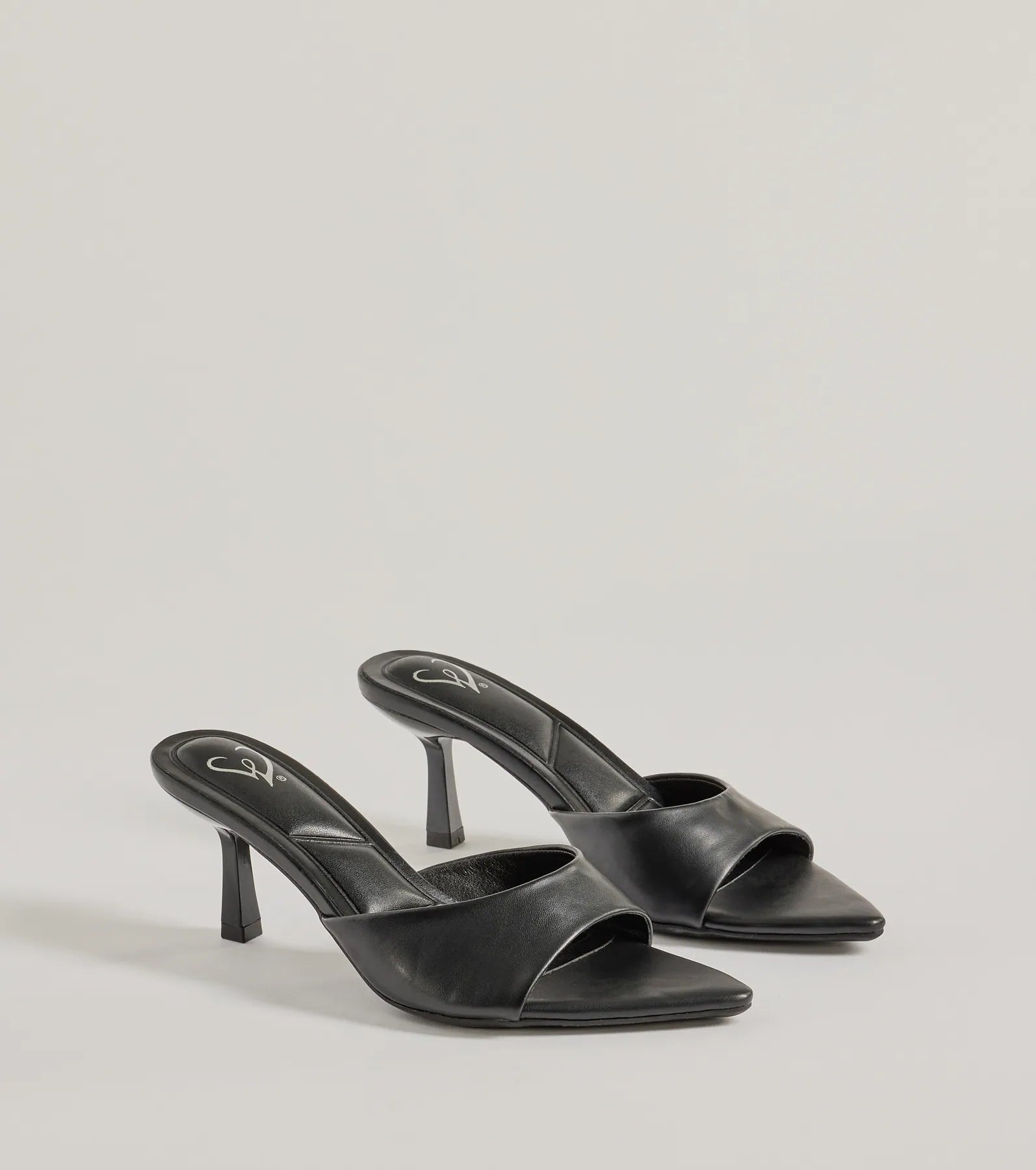A pair of heels feature a sleek pointed toe, luxe fit cushioned insole, and a trendy kitten stiletto heel. Perfect for styling with a satin cocktail dress.