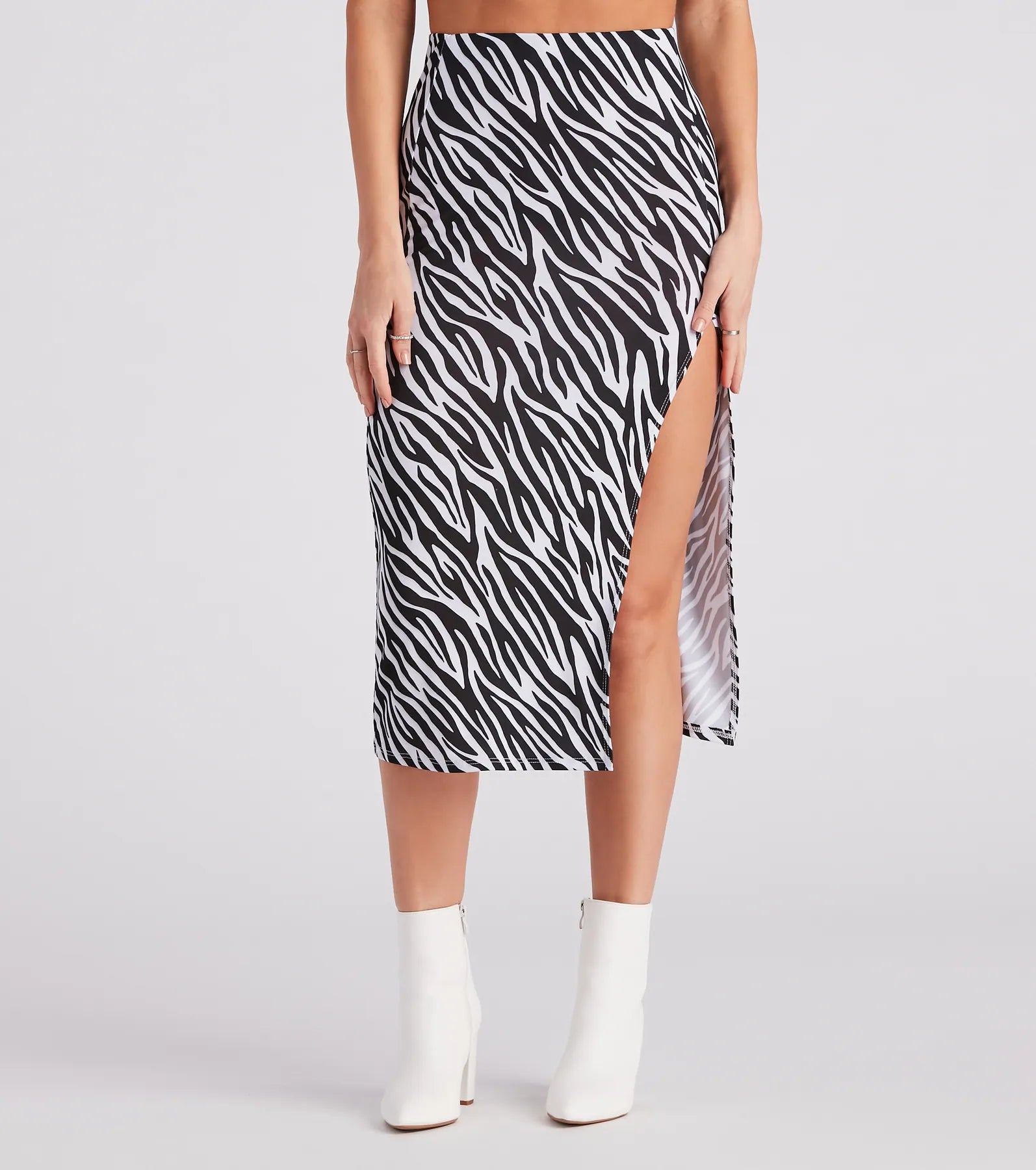 Show off a trendy wild style in this eye-catching zebra print midi skirt! It features a high-rise waist, a midi-length hem with a sultry thigh-high side slit, and a hip-hugging fit flowing out to an A-line silhouette. The skirt is composed of a knit fabric with a moderate stretch. Style with a basic bodysuit and ankle booties.