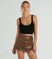 Babe, this faux leather mini skort is totally worth it! Featuring a sleek mid-rise waist, a front skirt overlay with a ruched seam, a bodycon silhouette, and shorts lining. Style with a best-selling corset top and heels to complete the look for a night out!
