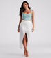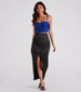 Get wrapped in chic vibes in this sleek satin maxi skirt! It features a high-rise waist with ruched detailing, a faux wrap-front design creating a high front slit, a maxi-length hem that hits right above the ankle, and a curve-hugging silhouette. Style with a cropped bustier and clear heels.