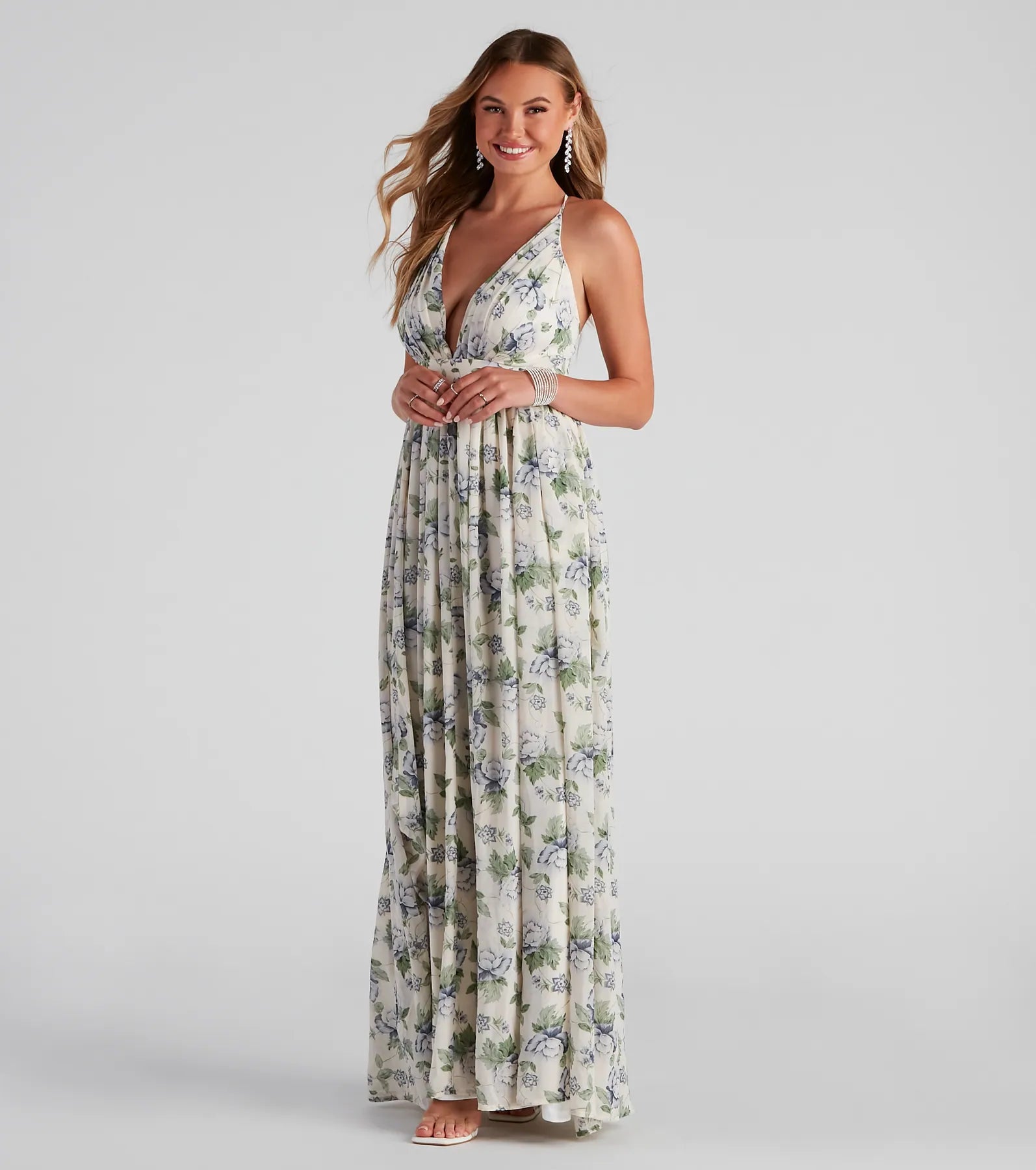 Let love bloom in a formal dress that brings the charm to your event! Zaya features a beautiful floral print, a sleeveless V-neckline, adjustable spaghetti straps that cross at the back, pleating throughout, and a high waist that leads to a flowy A-line silhouette. The dress is composed of a lined chiffon fabric that offers a relaxed fit with minimal stretch. Complete look with a rhinestone bracelet and heels.