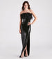 Flaunt your diva allure in the Zuri formal sequin dress to make a grand debut at school dances, sweet sixteens, or banquets! She features a strapless neckline with a statement feather bust, non-slip grip lining, and a flattering mermaid silhouette, high side slit, and floor-length hem. The formal dress is composed of a light-catching sequin embellished fabric with a stretchy knit lining. Complete the look in this long sequin dress with platform stiletto heels.